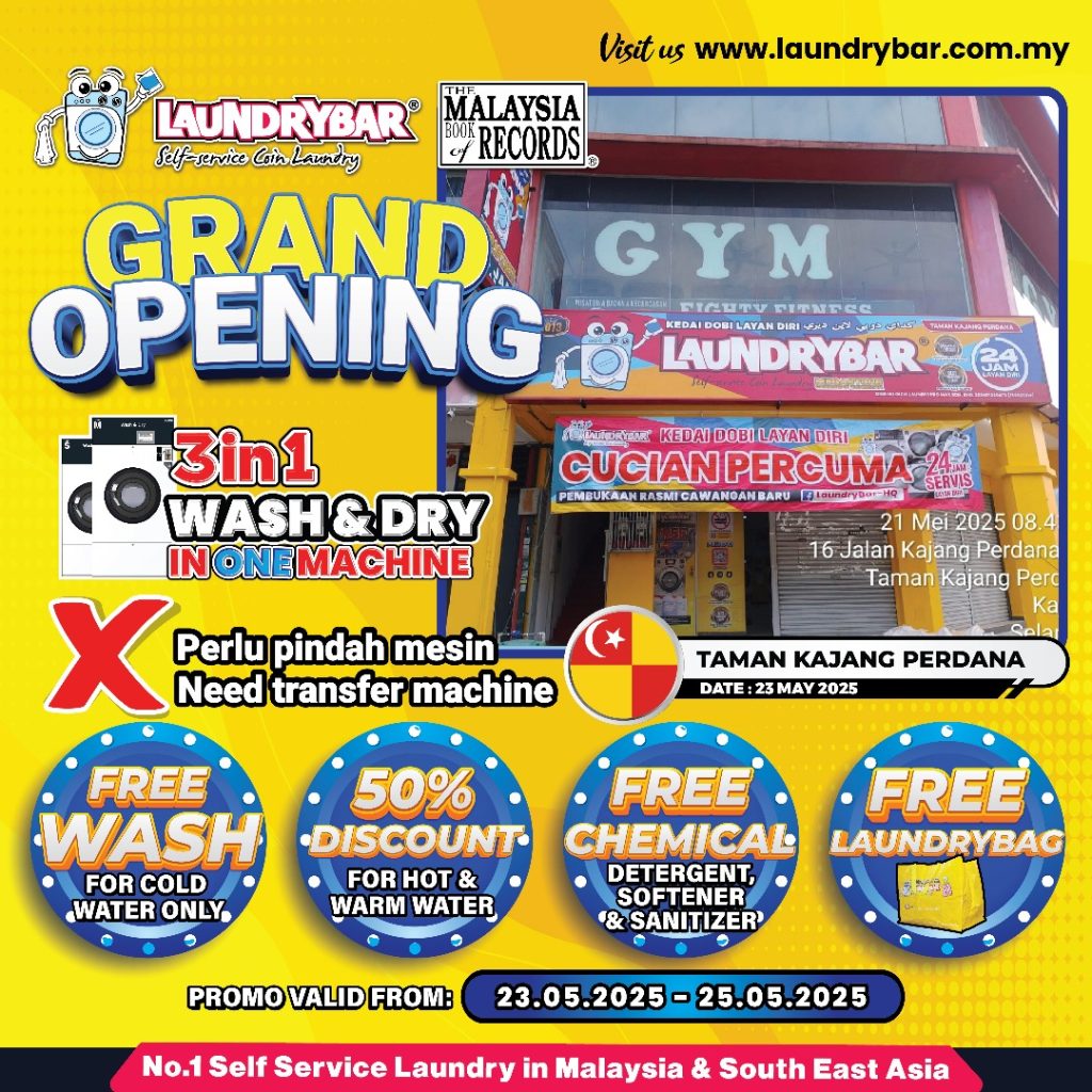 Hi warga Kajang!! Ada berita baik untuk korang!! Grand Opening outlet terbaru Laundrybar Megastore Taman Kajang Perdana akan dibuka pada hari Jumaat, 23 May 2025 ini.