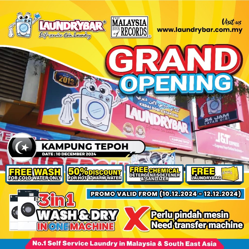Orang Terengganu!! Ada berita baik untuk korang!! Outlet terbaru Laundrybar Kampung Tepoh akan dibuka pada Selasa, 10 December 2024. Promosi FREE WASH selama 3 HARI sehingga 12 December ini.