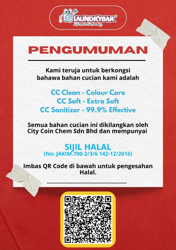 We would like to reassure our valued customers that all detergents and cleaning agents used in LaundryBar are Halal certified.
