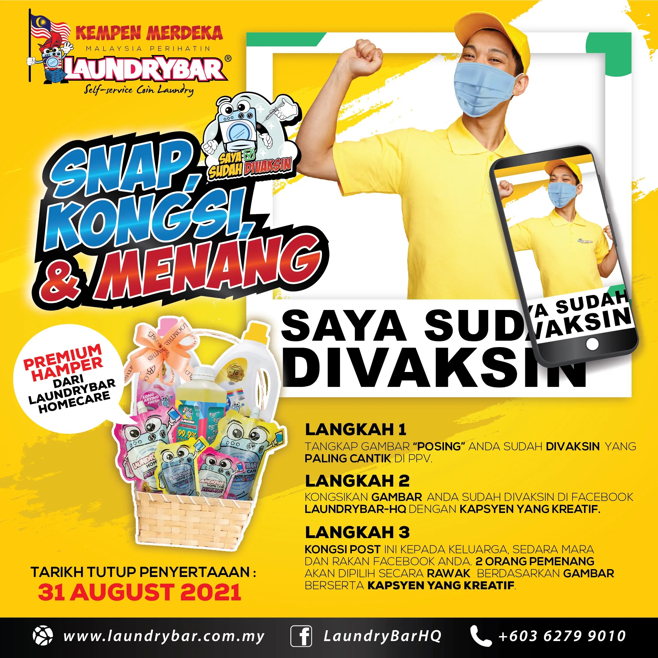 SNAP, KONGSI & MENANG bersama gambar selepas DIVAKSIN yang BERGAYA beserta KAPSYEN YANG KREATIF!! Jangan lepaskan peluang untuk memenangi PREMIUM HAMPER dari Laundrybar HomeCare.