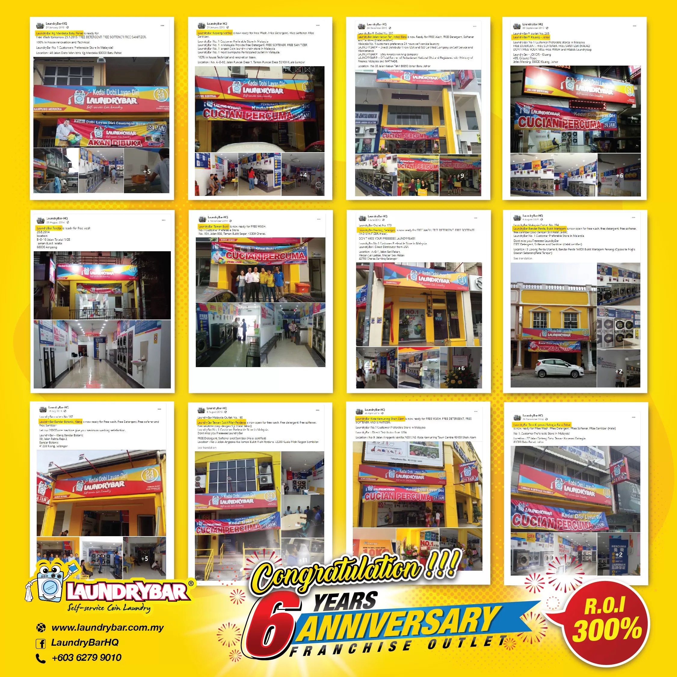 Tahniah diucapkan kepada rakan – rakan niaga kami kerana terus maju dan kekal bersama jenama LaundryBar sehingga kini setelah 6 tahun beroperasi.TERIMA KASIH kerana KESETIAAN bersama LAUNDRYBAR sejak tahun 2014 dan mendapat pulangan ROI sehingga LEBIH DARIPADA 300%. 💰💰💰💰